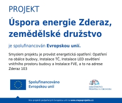 Projekt Úspora energie Zderaz, zemědělské družstvo je spolufinancován Evropskou unií. Smyslem projektu je provést energetická opatření: Opatření na obálce budovy, Instalace TČ, Instalace LED osvětlení vnitřního prostoru budovy a Instalace FVE, a to na adrese Zderaz 103.